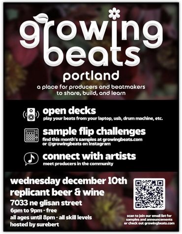 Growing Beats is a place for producers and beat makers of all ages and skill levels to share, build and learn about production! Created in 2024 by Portland native producer, Surebert, Growing Beats aims to provide a space for creatives to network and share their work via a Monthly Sample Flip challenge and Open Deck beat sets!